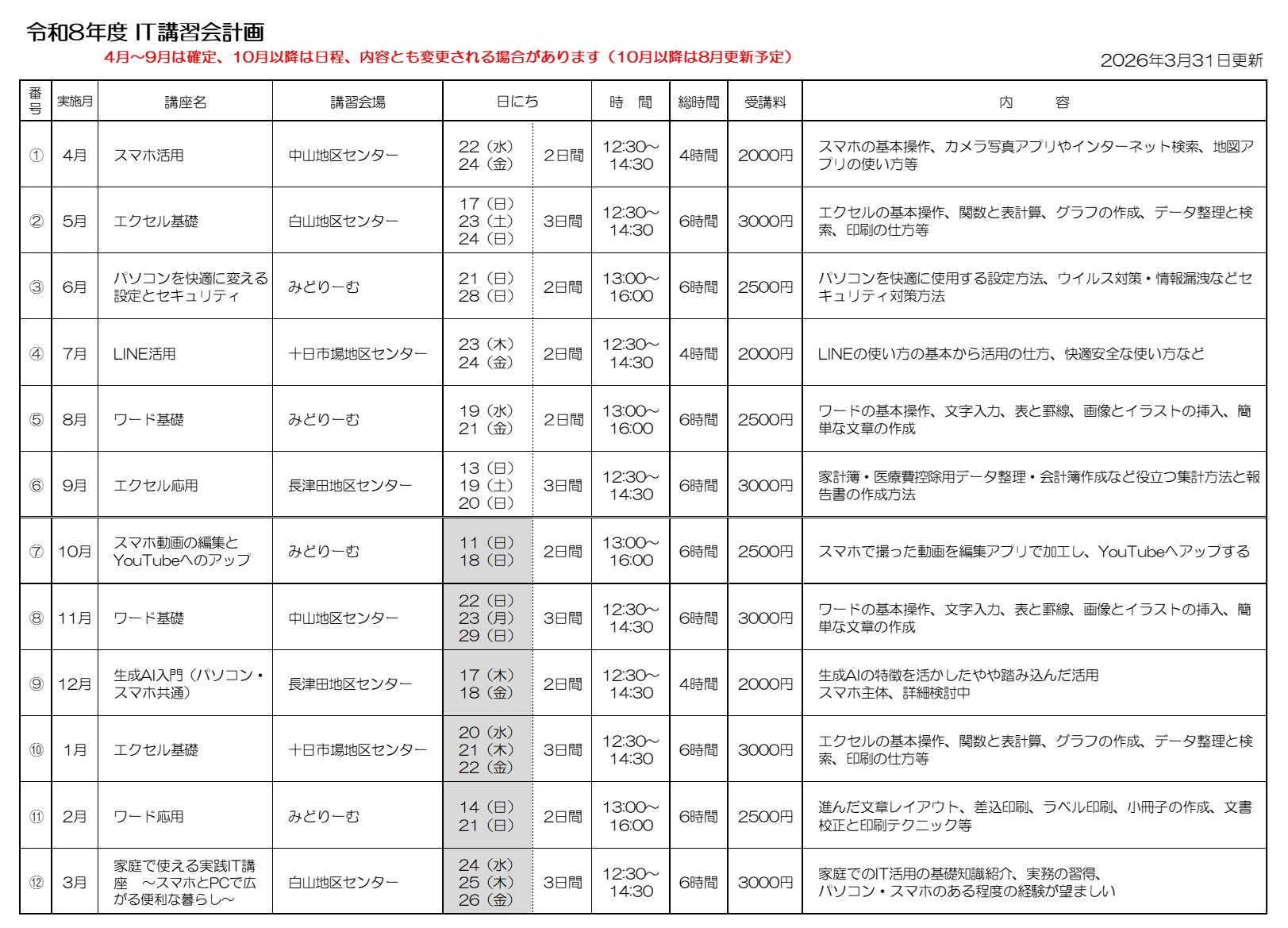 2026年度緑区IT講習会計画表